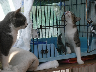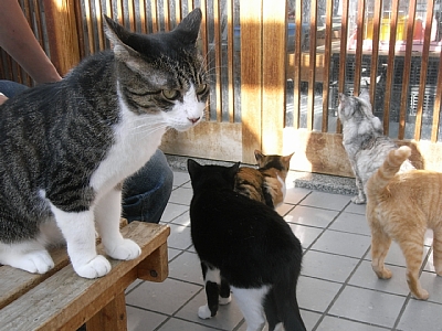 手を消毒した後はテラスを改造した猫部屋へ…おおぅ無数の駄猫たちが!!! 「丁度ごはんの準備中なので、ちょっと落ち着きがないかも知れません」と言われたのですが、いや、落ち着きがないどころか殺気立ってます。何かを訴えながらドアを注目しまくる猫たち。猫の数が多い上、個別の猫の状態に合わせた食事を用意しているので、なかなか食事が出てきません。