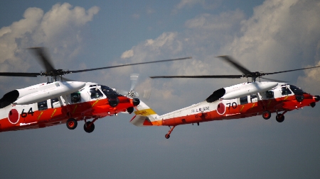 | 展示飛行を終えたヘリコたちが、離陸時と同じ編隊で次々に戻ってきます。2機なら2機、3機なら3機のシンクロっぷりが本気で美しいです。いつまでも見ていたいなぁ… | ||