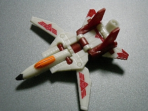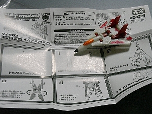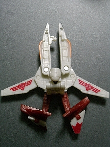 | ビニールにコロンと入って、説明書つき。左の画像が本来のデルタ翼機体型ですが、翼が動くのでなんちゃって可変翼ww なんてこともw | ||