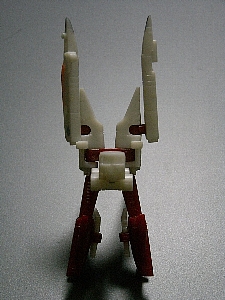 | さて変形。 ノズル部分を起こして… その次がスゴイ。まさか胴体真っ二つとはかなり大胆。ここで実は一度、片側の胴体が取れるという悲劇があったので、もうドキドキもんであります。 |