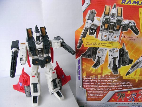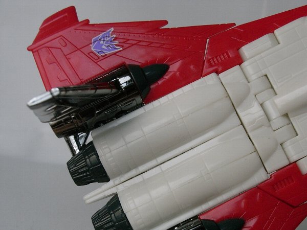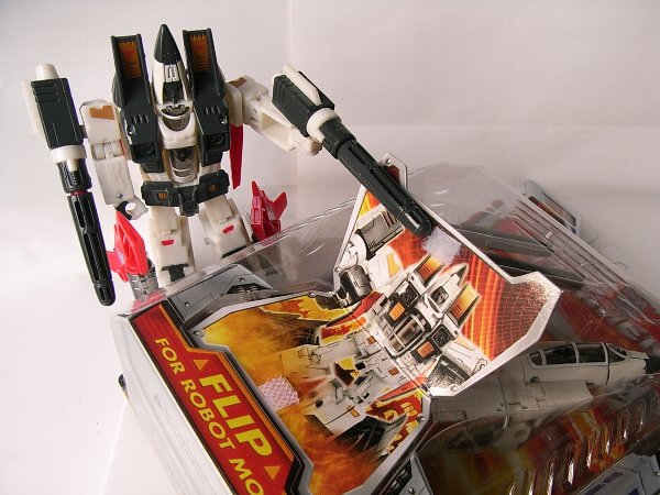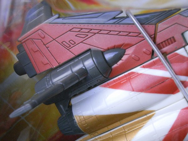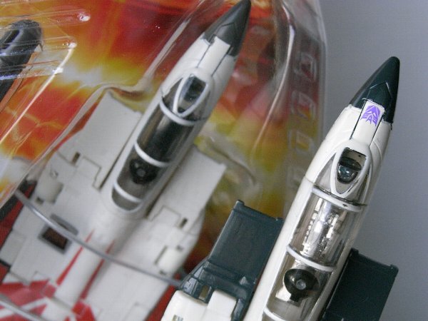 | 似ているようで、やっぱりいろいろ違う。クラシックスのキャノピーはスモークがかかっていましたがが、変形(右側)ではコクピット内部がメッキになった分、中が良く見えるようにか透明に。ノーズにはデ軍エンブレムが追加されました。 | |