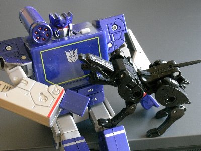 | カセットにしておけば復刻サウンドウェーブに格納できるような気がしますが、大きさ比で言うとサウンドレーベルの音波さんが意外とイケる! 「ごはんー!」。おおおお!見たかった光景が今、ここに…! なんだか久し振りに、模型を買って素直に感動している自分がいます。 |