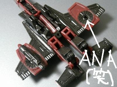 | 後ろから。…これで合ってるよね!?と慌てたくなるスカスカ振りに加えて激しく棒立ちですが、ちっさくてかわいく、生意気に変形までして、しかもブラインドパッケージというのが楽しいですよね。リアルタイムで集めていたらかなり燃えたかも知れない。 |