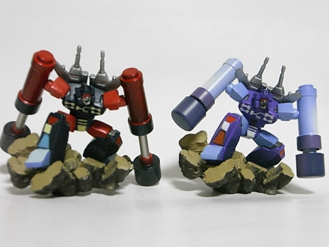 で、前回は「ハンマーアームが固定」なんて書いてましたがちゃんと延びました。疑ってゴメンよフレンジー。左、ランブルがめいっぱいアームを伸ばした状態。 |