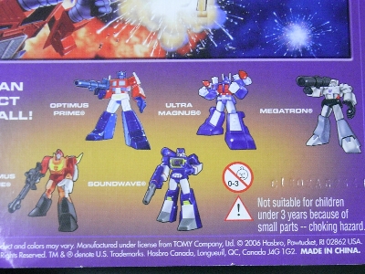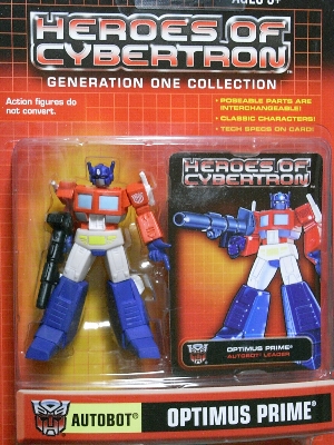 | HEROES OF CYBERSTON Generation One Collection 小さいので、ブリスターごと飾りたくなるかわいらしさ!カードもついてますv オプティ、カードのイラストでは両肩にボッツの部隊章付きなのに、本体の右肩には何も入っていないのは何故? |