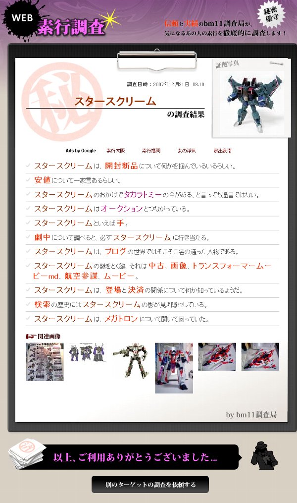 特定の人物名、キャラ名(でなくてもいいけど)を入力すると、素行調査を行って結果を表示してくれる。仕組みとしては以前紹介した「全自動4コマ」と同様、検索エンジンで釣れたものをランダムで配置しているもようです。ですのでTFキャラで試すとどうしても玩具系のネタに偏ってくる。玩具屋が如何にSEOに注力しているかという証左と言えましょう。